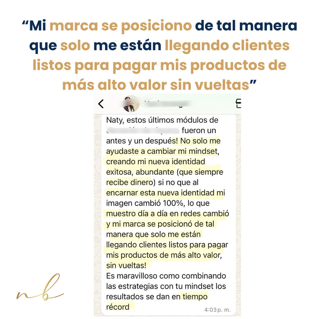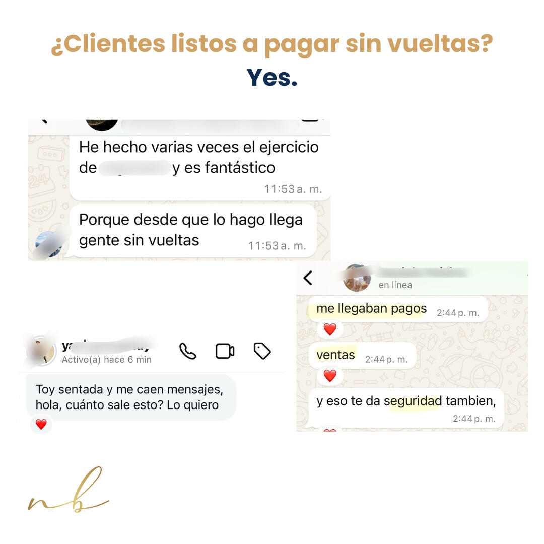 💸 Estar desayunando lento o viajando por el mundo (como varias de mis clientas) mientras recibes pagos de clientes de alto nivel que no requirieron ni de llamadas de venta ni de miles de preguntas para pagarte lo que tu cobras, porque es obvia su elección por tu energética, autoridad y comunicación.💸 Atraer a tus espacios clientas de alto nivel que se auto lideran, entienden tus límites y te pagan miles de dólares sin vueltas, lo que significa más cash de ventas mes a mes sin agotamiento.💸 Sostener a largo plazo y seguir evolucionando tu negocio, ingresos y precios sin resistencias, sabiendo que eres más que suficiente y mereces ser altamente pagada por lo que ofreces.💸 Comunicar con total claridad antes y después de la subida de precios y tu audiencia va a seguir comprando sin problemas, porque ya sabes que hacer en tu comunicación y lenguaje para que lo perciban como obvio y parte de tu expansión.💸 Retener a los clientes de alto nivel en tu mundo comprándote una y otra vez, porque sabes que hacer dentro de tus espacios que hará que no se quieran ir.