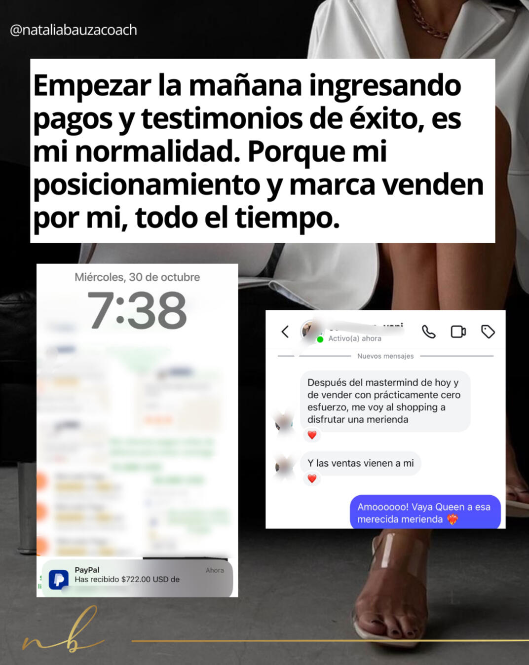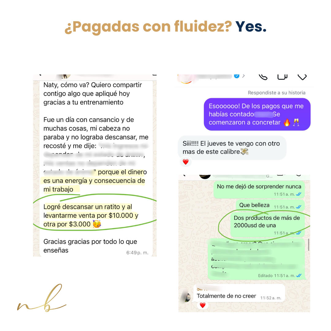 💸 Estar desayunando lento o viajando por el mundo (como varias de mis clientas) mientras recibes pagos de clientes de alto nivel que no requirieron ni de llamadas de venta ni de miles de preguntas para pagarte lo que tu cobras, porque es obvia su elección por tu energética, autoridad y comunicación.💸 Atraer a tus espacios clientas de alto nivel que se auto lideran, entienden tus límites y te pagan miles de dólares sin vueltas, lo que significa más cash de ventas mes a mes sin agotamiento.💸 Sostener a largo plazo y seguir evolucionando tu negocio, ingresos y precios sin resistencias, sabiendo que eres más que suficiente y mereces ser altamente pagada por lo que ofreces.💸 Comunicar con total claridad antes y después de la subida de precios y tu audiencia va a seguir comprando sin problemas, porque ya sabes que hacer en tu comunicación y lenguaje para que lo perciban como obvio y parte de tu expansión.💸 Retener a los clientes de alto nivel en tu mundo comprándote una y otra vez, porque sabes que hacer dentro de tus espacios que hará que no se quieran ir.